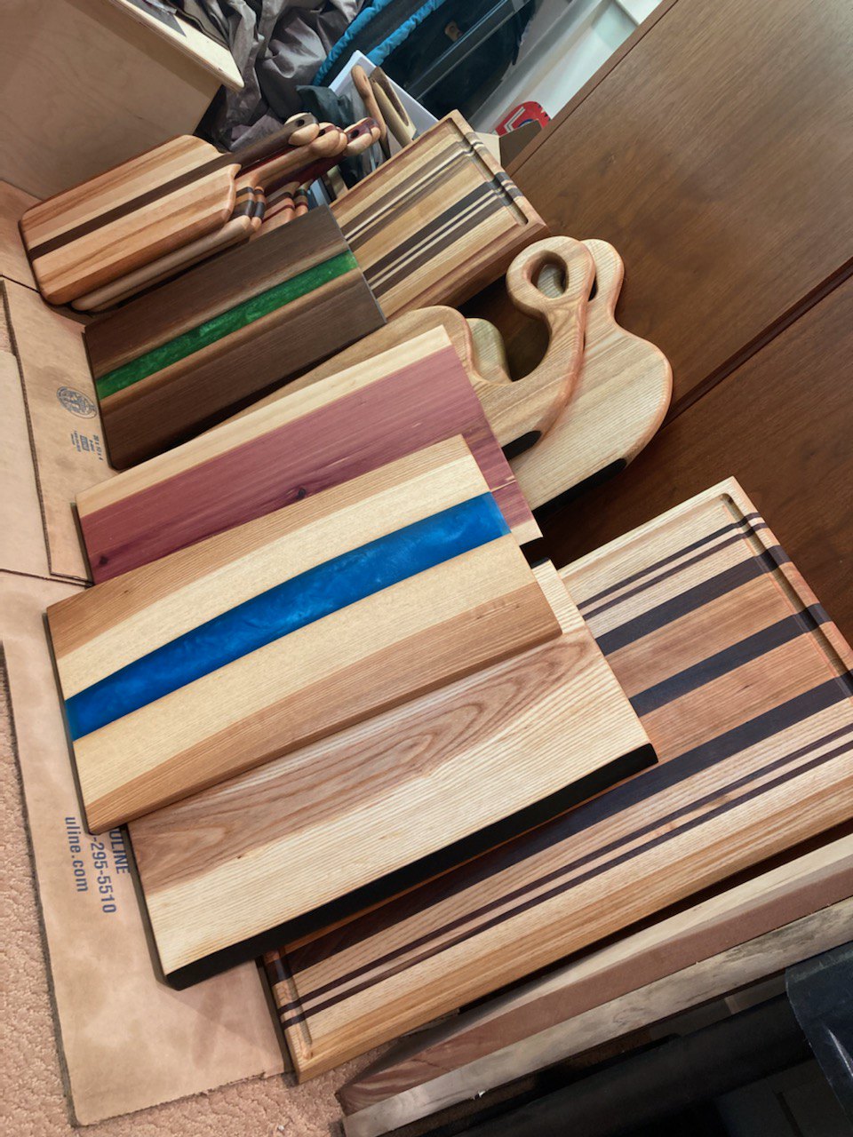 Handcrafted wooden cutting/charcuterie boards, live edge/epoxy trays, tables
