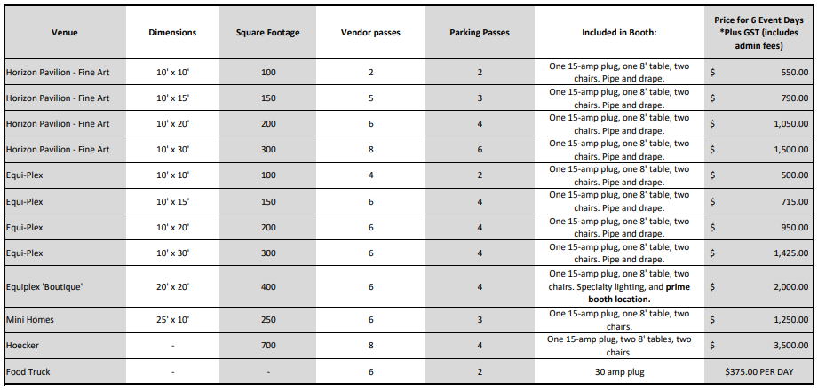 *All booth prices are subject to 5% G.S.T. Please be aware that venue, exhibit, and booth layouts may change without notice and booth preference cannot be guaranteed. Spruce Meadows Management reserves the right to change, without notice; the floor layout as registrations, building code, and aesthetics dictate.