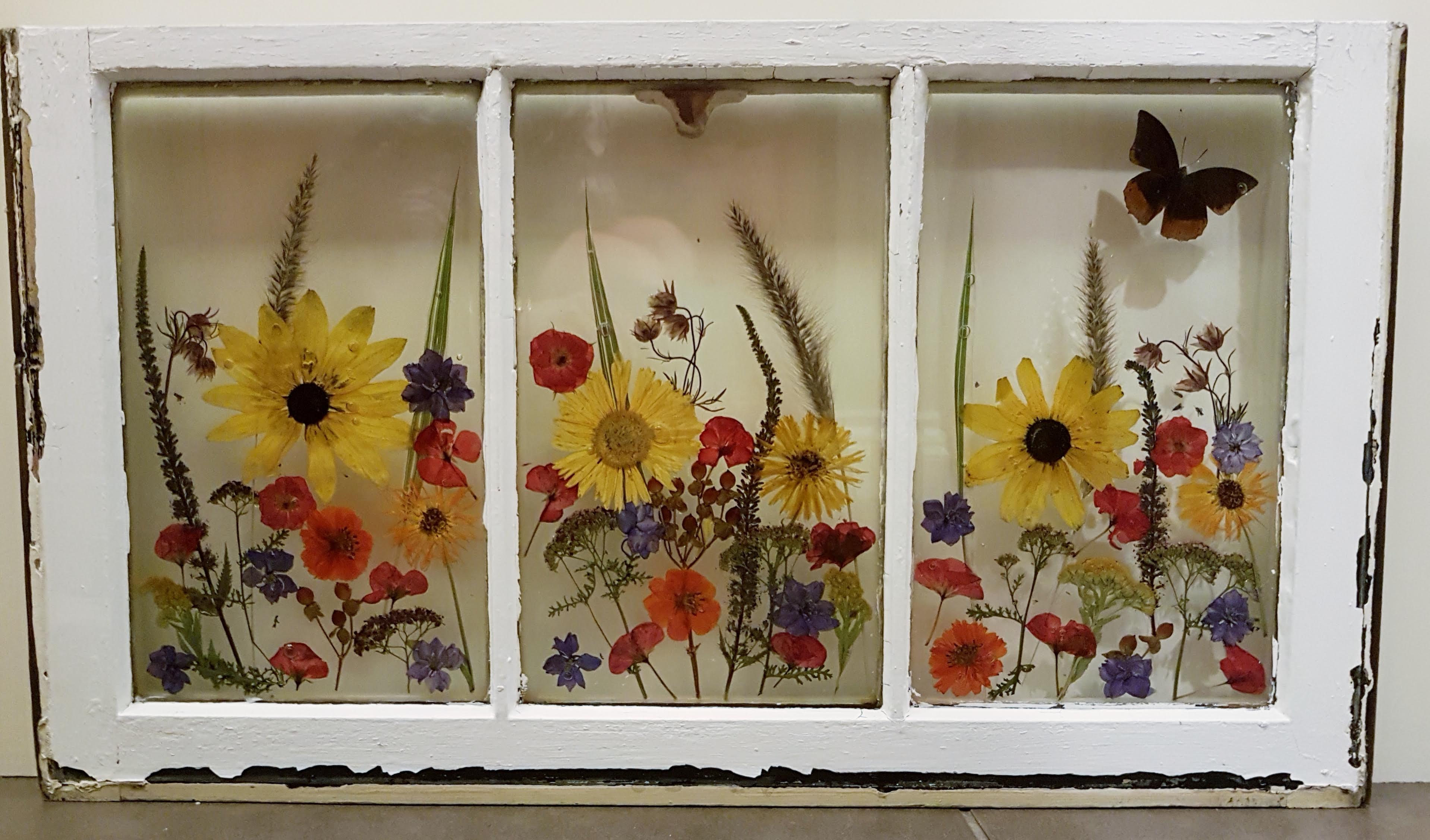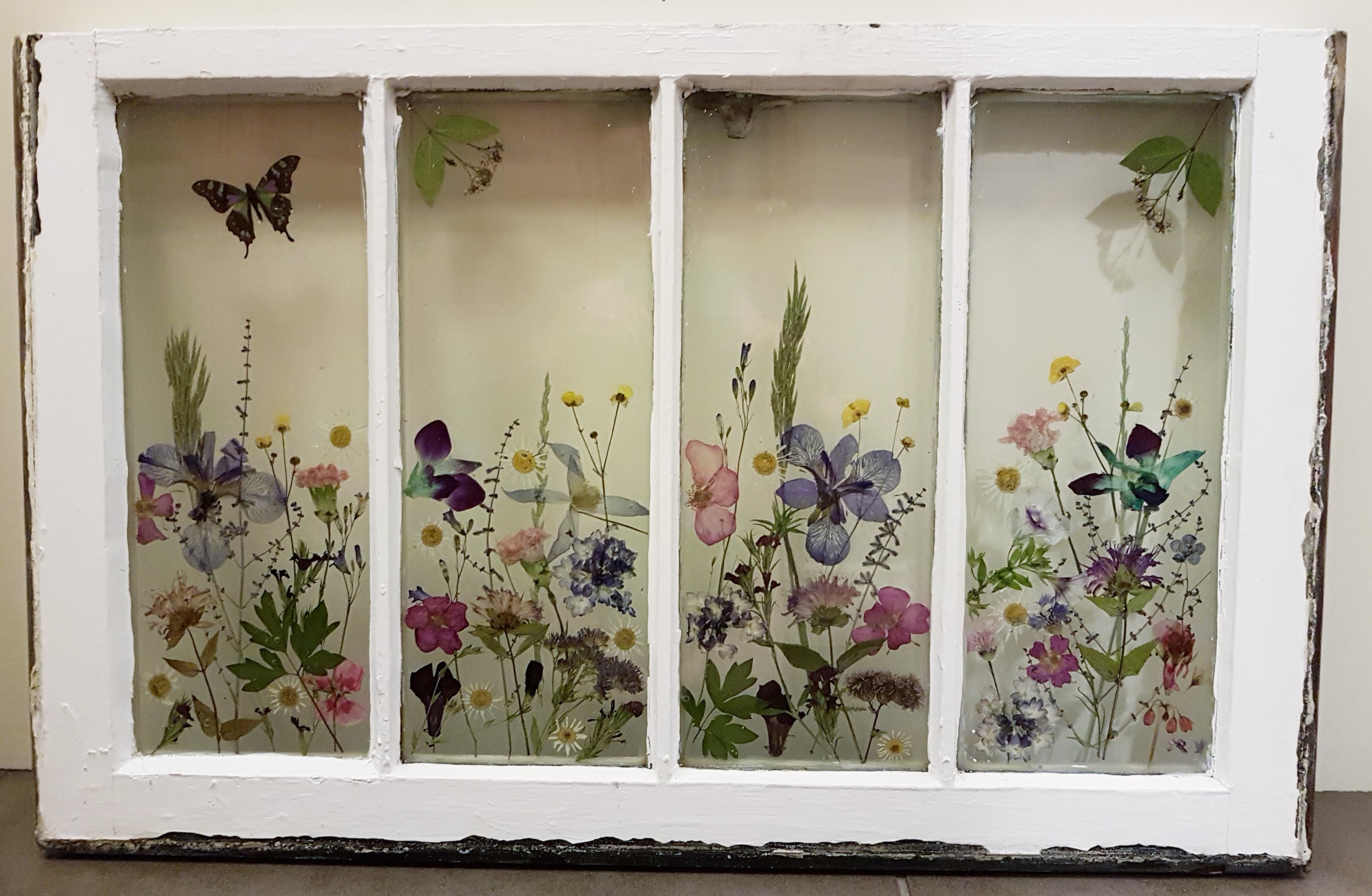 Beautifully pressed flowers preserved in resin, in vintage windows and frames.