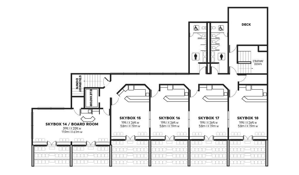Explore the Georgian Room on the main floor of the British House, offering a formal foyer, sitting area, bar, and classic fireplace with views of the iconic International Ring. Five luxury skyboxes on the upper level serve as practical meeting rooms or flexible break-out areas during larger events, with one standing out as a private 14-guest boardroom.